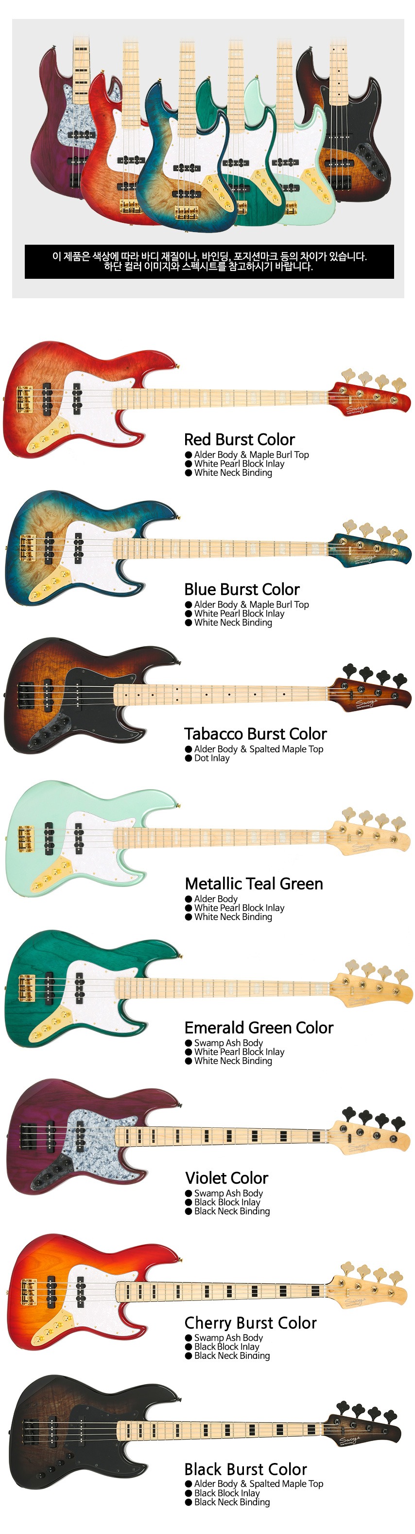 스윙의 Jazz V 베이스 시리즈는 스윙에서 야심차게 준비한 재즈베이스 신형 모델입니다. 컬러마다 다양한 스펙의 조합과 함께 뛰어난 완성도를 갖춘 모델로서, Alder 와 Swamp Ash 바디와 Burl Top, Spalted 탑 등 다양한 선택의 폭으로 유저들의 성향에 맞게 선택하실 수 있습니다. 안정적인 튜닝을 자랑하는 스윙 빈티지 타입의 헤드머신이 채용되었으며, 액티브 서킷과 스윙 JJ 픽업으로 따뜻하고 선명하며, 힘있는 사운드를 표현해줍니다. 고급스러운 하드웨어와 높은 스펙을 갖춘 제품으로 뛰어난 가성비를 자랑하는 재즈 베이스입니다.