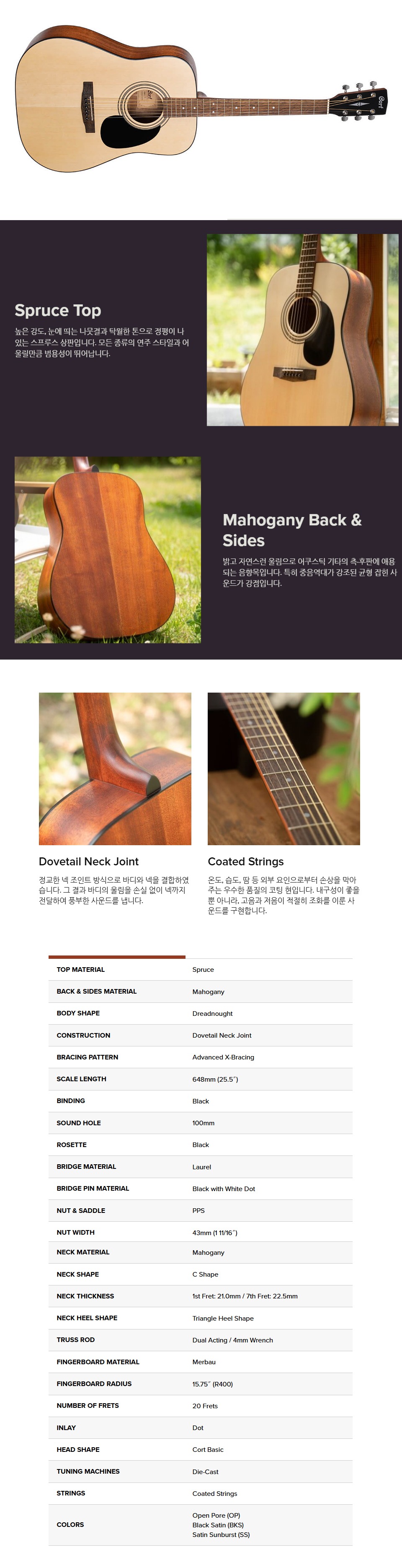 Cort의 가장 역사가 깊은 어쿠스틱 기타 라인인 스탠다드 시리즈는 뛰어난 성능과 합리적인 가격으로 많은 사랑을 받아왔습니다. 각기 다른 스펙으로 무장한 라인업을 갖추고 있어, 입문자 및 취미로 기타를 치는 분들께 다양한 선택지를 제공합니다. 그중 Standard AD810은 스프루스 상판, 마호가니 측·후판, 멀바우 프렛보드가 특징입니다.