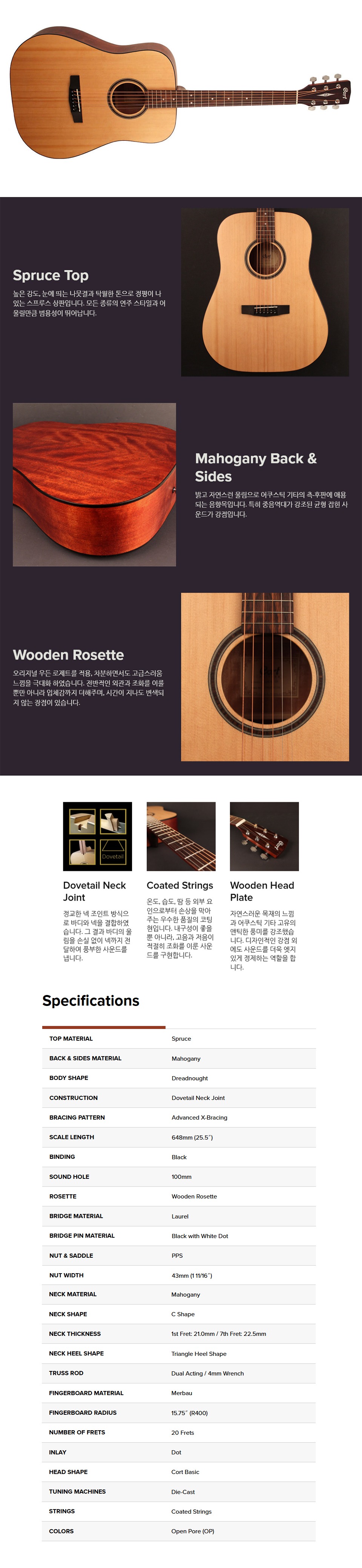 Cort의 가장 역사가 깊은 어쿠스틱 기타 라인인 스탠다드 시리즈는 뛰어난 성능과 합리적인 가격으로 많은 사랑을 받아왔습니다. 각기 다른 스펙으로 무장한 라인업을 갖추고 있어, 입문자 및 취미로 기타를 치는 분들께 다양한 선택지를 제공합니다. 그중 Standard AD850은 스프루스 상판, 마호가니 측·후판, 멀바우 프렛보드가 특징입니다.