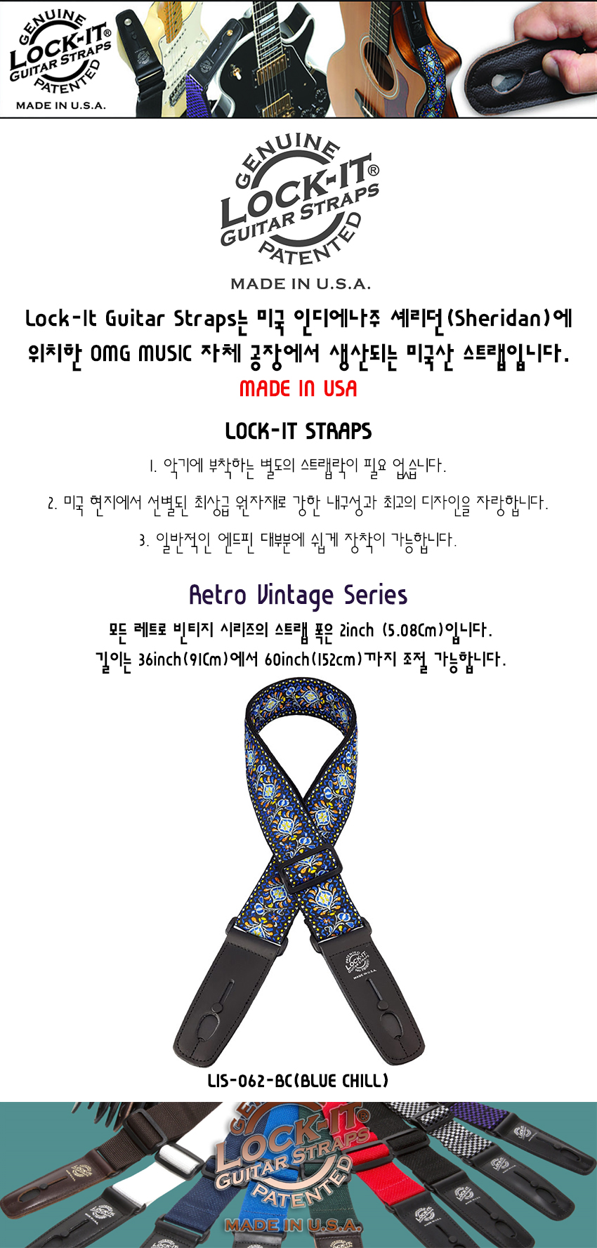 LOCK-IT - Retro Vintage Guitar Strap 스트랩락 내장 기타스트랩 - Blue Chill