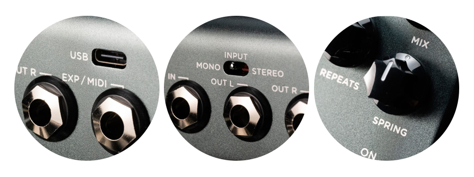 다양한 기능 MIDI 새로운 El Capistan 은 완전한 MIDI 구현을 지원합니다. EXP/MIDI 잭 또는 USB-C 연결을 통해 컨트롤러 또는 DAW에서 MIDI 신호를 전송하여 원격으로 모든 스위치, 노브 및 설정을 제어할 수 있으며 모든 설정은 300개의 각 프리셋에 자유롭게 저장할 수 있습니다.