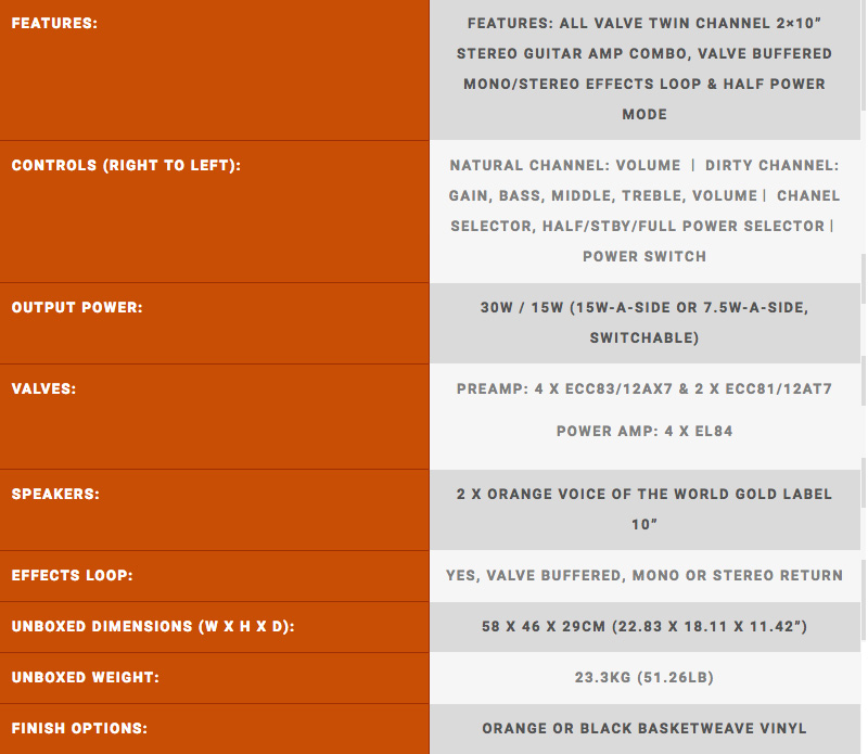 Rocker32는 클래식한 오렌지의 매력을 그대로 담고 있고 2 x 10인치 스피커의 조합은 작은 공간임에도 풍부하고 여유로운 전달을 의미합니다. 그리고 대부분의 평범한 트윈 스피커 콤보보다 더 넓게 퍼지는 사운드를 제공하는 특별한 회로구성도 가지고 있습니다.