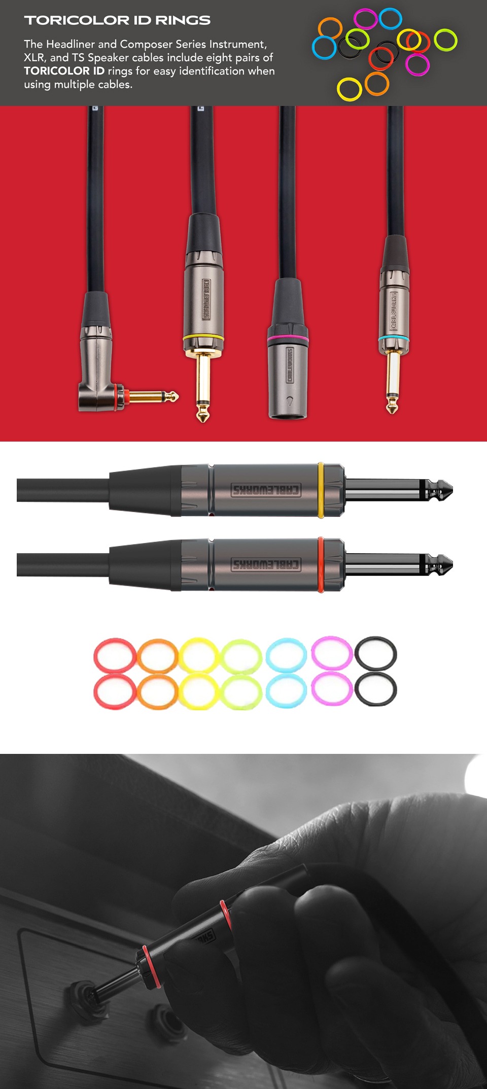 여러 케이블을 동시에 사용할 때 케이블을 쉽게 식별할 수 있는 TORIColor ID 링과 전용 파우치가 동봉됩니다.
